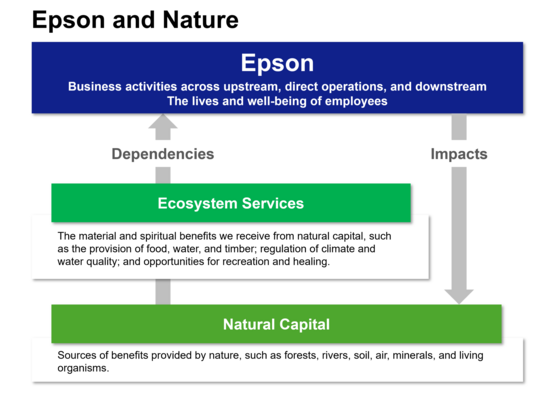 Epson’s business activities and employees' lives are supported by ecosystem services ("Dependences" in the diagram). Additionally, our activities have both direct and indirect impacts on nature ("Impacts" in the diagram).