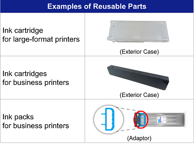 Under the ink container recycling program currently in operation in Japan, we collect ink cartridges and ink packs that customers have finished using, sort out the reusable parts, and manufacture products using those parts to deliver them to customers again.