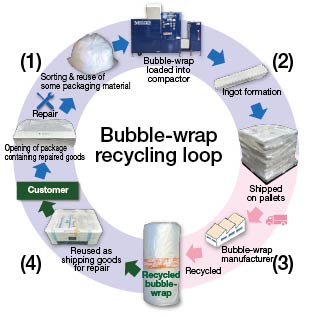 In this scheme, (1) packaging materials for incoming products are sorted and some are reused; (2) the bubble-wrap is compacted for efficient transportation and (3) delivered to the manufacturer as raw material; (4) recycled cushioning material is purchased and used when shipping repaired products back to customers.