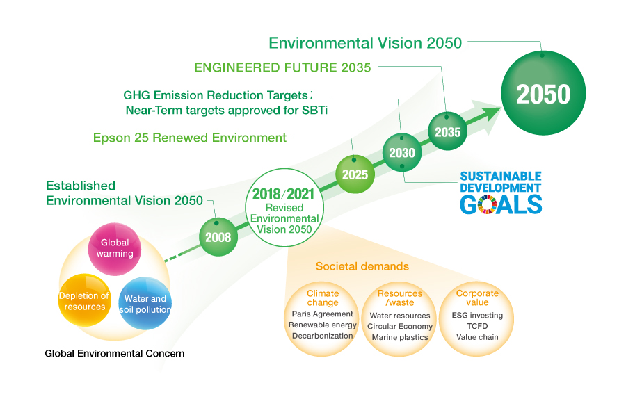 In March 2021, Epson further revised the vision, setting specific goals that reflect Epson's strong commitment to addressing major societal issues such as decarbonization and resource recycling.
