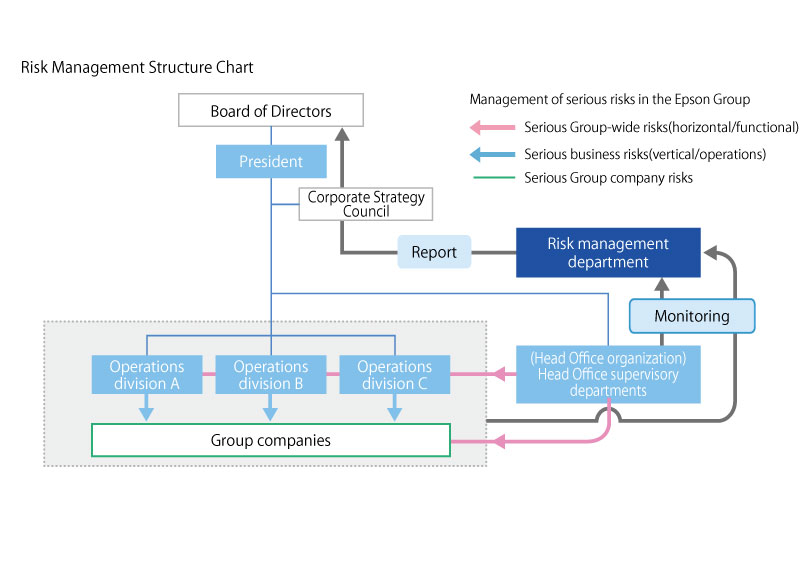 Based on the Basic Internal Control System Policy, overall responsibility for risk management in the Epson Group, including subsidiaries, belongs to the president of Seiko Epson. Group-wide risk management is carried out by Head Office supervisory departments with the cooperation of the operations divisions and subsidiaries. Risks unique to an individual business are managed by the Chief Operating Officer of that business, including at subsidiaries consolidated under them. The Company has also set up the risk management department, monitors overall risk management Group-wide, makes corrections and adjustments thereto, and ensures the effectiveness of risk management programs. The risk management organization is defined in the Epson Group Risk Management Basic Regulations.