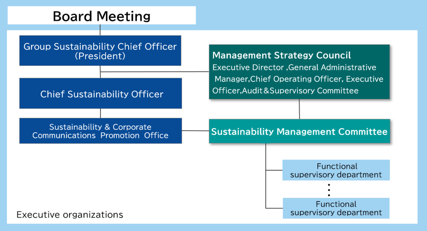 The Sustainability Management Committee, made up of the heads of relevant departments, examines sustainability matters that require specialized knowledge and submits reports and recommendations to the Management Strategy Council.