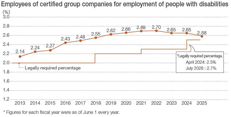 | Advancement of people with disabilities | Enable people to contribute to the company’s performance by taking on challenges and continuing to grow regardless of whether they have disabilities. Achieve a 3.0% real employment rate of people with disabilities in FY2030. |