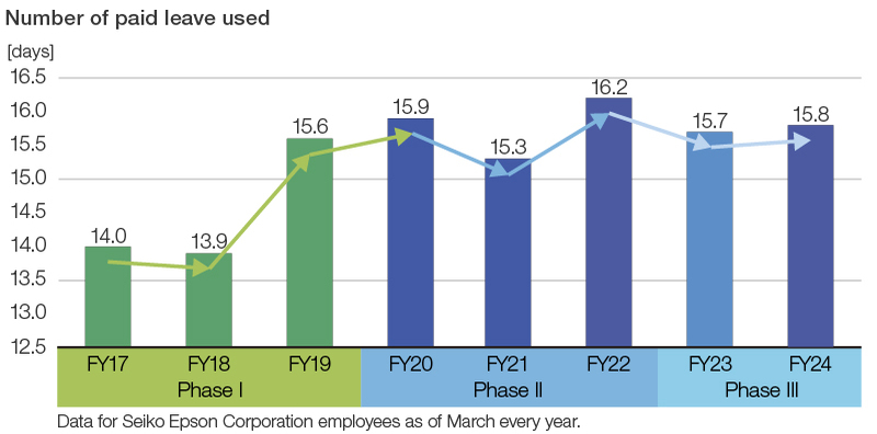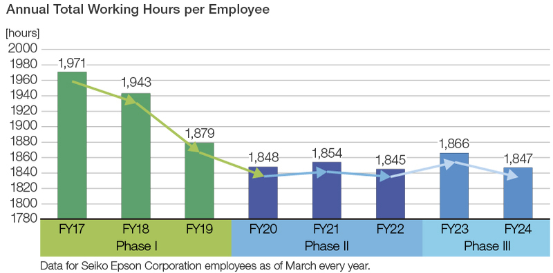 Seiko Epson has been acting to more closely manage working hours and prevent long working hours as part of work reforms we began in 2017 and as a priority field in our Health Action 2025 medium-term health management measures we enacted in April 2022. In addition to ensuring legal compliance by familiarizing employees with an operations manual for managing working hours, we monitor in-out times and hours spent at work with automated tracking systems. We also remind personnel of the importance of maintaining reasonable working hours.