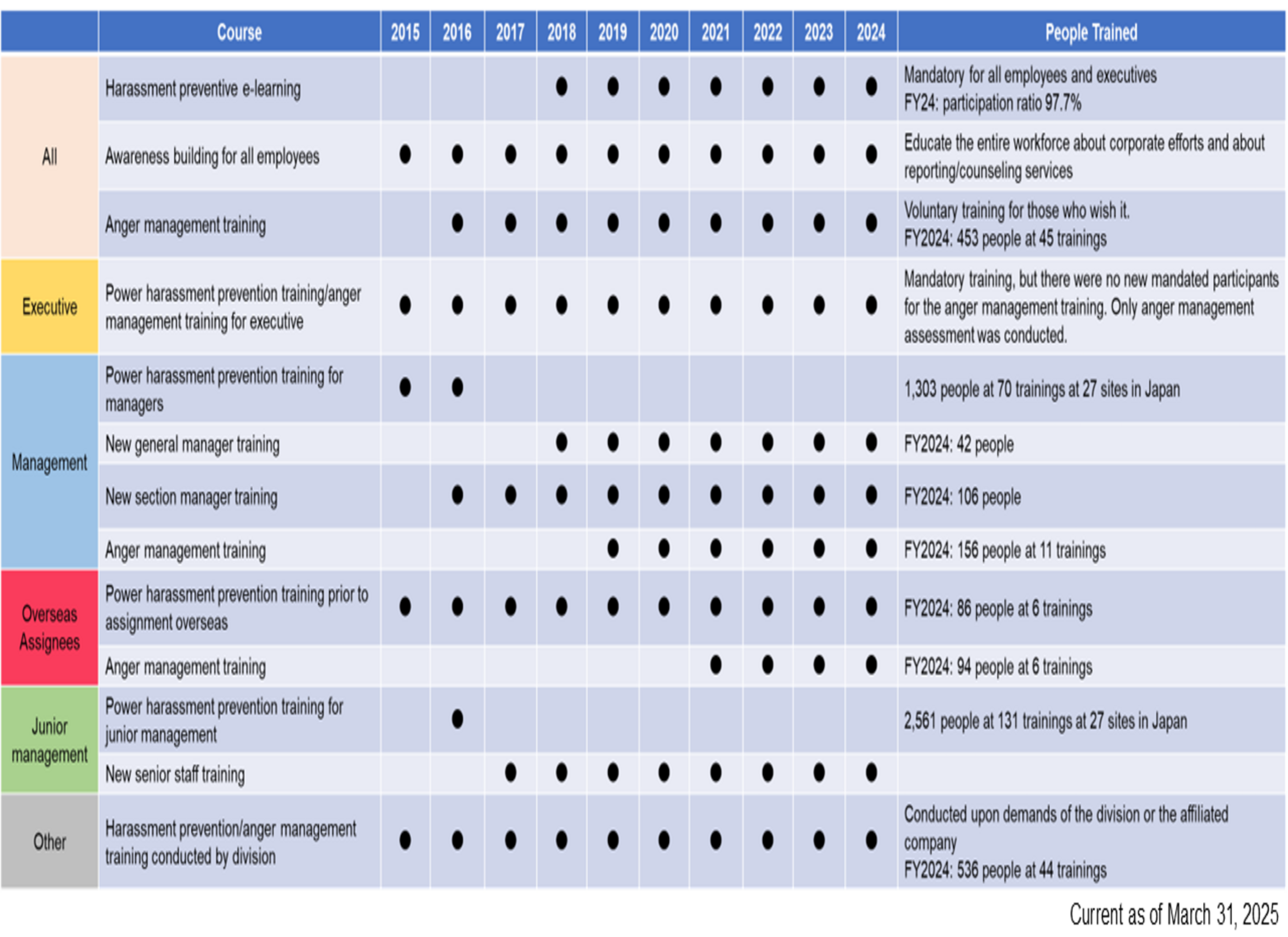In addition to these measures, since FY2021, we have been promoting the creation of an organizational climate free of power harassment by taking detailed measures tailored to individual workplaces, such as individual follow-up for high-stress workplaces in conjunction with health management information and the establishment of a consultation service for management-level employees.