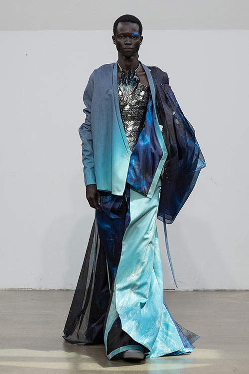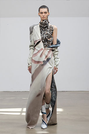 今回のコレクションでは、YUIMA NAKAZATOは26体の作品を発表しました。その中で、ドレスやパンタロン、ジャケットなどを含めた衣装の数々にデジタル捺染プリントが利用され、完成作品としての魅力を最大限引き出しています。