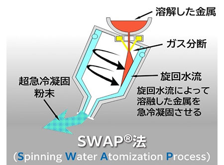 *3 SWAP®(Spinning Water Atomization Process)法はアモルファス合金の量産を実現するアトミックス独自の合金粉末製造法です。高周波炉で溶解させた合金に、高圧のガスと冷却水を噴射し毎秒数十万℃もの超急速冷却をすることで、アモルファス(非晶質)状態の合金粉末を製造します。アトミックスは2004年に、毎秒数十万℃以上もの超急速での冷却による凝固を可能にした独自のSWAP®法を開発し、アモルファス合金粉末の量産に世界で初めて成功しました。その後もアモルファス合金粉末特有のノウハウを積み重ね、技術的に量産が難しいアモルファス合金粉末の数少ないサプライヤーとして、お客さまへの安定供給に努めてまいりました。