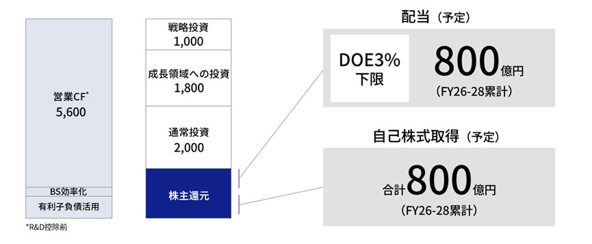 この収益基盤の変革によって生み出されたキャッシュは、規律ある資本配分を前提に、長期的な価値創出の最大化につながるテーマへ積極的に充当します。M&Aなどの戦略投資に加え、成長エンジンであるプレシジョンイノベーション領域や、次期以降の成長ドライバーと位置付けるインダストリアル&ロボティクスの成長領域への投資として、3年間で2,800億円を投下します。