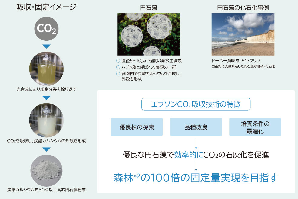 自社によるCO2排出の削減に加え、エプソンは大気中のCO2の回収・固定や活用につながる技術の開発も進めています。気候変動の緩和に貢献するため、こうした技術の実用化を目指していきます。