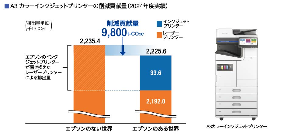 エプソンのインクジェットプリンターは、インク吐出に熱を使わない「Heat-Free Technology」による電力消費の抑制に加えて、定期交換部品も少なくて済みます。これにより、レーザープリンターからの置き換えを進めることで、印刷に伴う環境負荷を削減し、社会全体の環境負荷低減に貢献することができます。お客様に対して公正な情報になるように、WBCSD(持続可能な開発のための世界経済人会議)が公開したガイドラインを参照しつつ、第三者機関の確認に基づいて算定ロジックを策定しました。2024年度の実績として、レーザープリンターからエプソンのA3カラーインクジェットプリンターへの置き換えによる削減貢献量は、9,800t-CO2e*1となります。