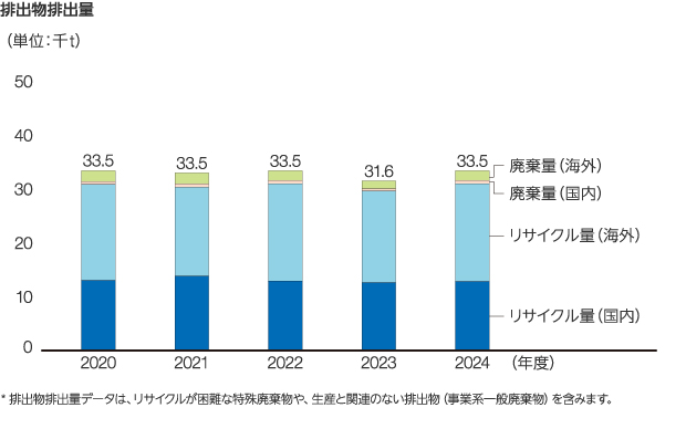 生産工程やオフィスなどから発生する全ての排出物は、拠点内での減量化や再利用、工程内でのプラスチックのランナーリサイクルなどを可能な限り実施したうえで、処理業者へ委託して再資源化することを基本としています。また、排出物は分別を徹底し、より適切なリサイクル方法や業者を選定しています。今後も、排出物の削減を継続的に進めるとともに、リサイクル業者との連携を含めた排出物処理方法の総合的な改善に取り組んでいきます。