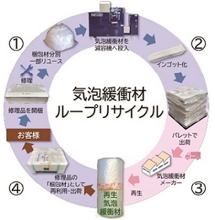 まず修理品の入荷に伴い発生する梱包材を①分別し、品質の良いものを一部リユースします。次に気泡緩衝材は②社内で減容化して輸送負荷を抑制したのちに、③気泡緩衝材メーカーに原料として納入。④再生緩衝材として再度購入し、修理品の梱包材に利用してお客様にお届けする仕組みです。これにより、年間で4.2tの廃棄物、3.9tのCO₂を削減するとともに、サステナブル資源率80%以上(再生材80%以上使用)の気泡緩衝材の継続利用を実現します。