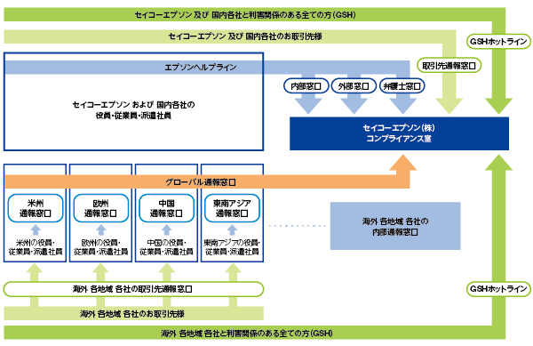 エプソンは、把握が難しいコンプライアンス問題を早期に把握するため、役員・従業員および派遣社員からの情報を入手する手段として、通報窓口を設置し、その中から懸念される事案について報告が上がる仕組みを整えています。企業行動原則とエプソングループ通報制度規程に、通報情報の厳格な管理と通報者への不利益な取り扱いや報復行為等の禁止、匿名性の確保などの通報制度の守るべき基本を定め、当社および米州・欧州・中国・東南アジア含む全てのグループ会社はこれに基づいて通報窓口を設置しています。