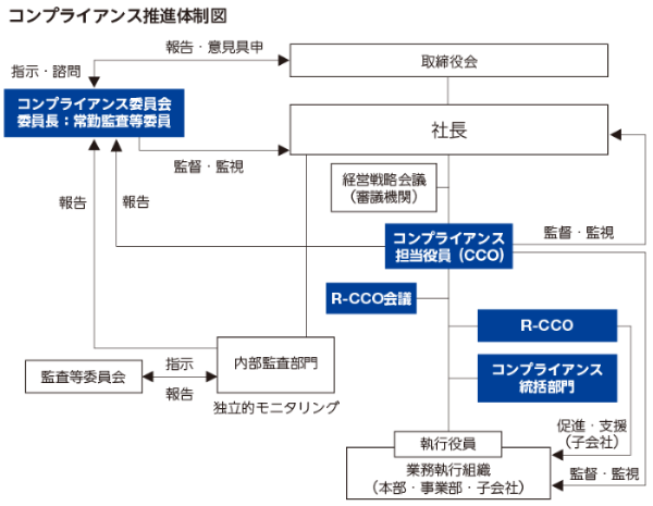 コンプライアンス委員会は、取締役会の諮問機関として社外取締役6名全員および常勤監査等委員である取締役1名で構成しています。委員長は常勤監査等委員が務め、コンプライアンス活動の重要事項について審議し、取締役会に報告・提案することで業務執行を監督・監視しています。コンプライアンス担当役員(CCO:Chief Compliance Officer)は、コンプライアンスにおける業務執行全般を監督・監視し、コンプライアンス委員会にその状況を定期的に報告します。