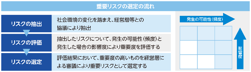 その特定した重要リスクに対し、制御計画の立案・実行と進捗状況のモニタリングを定期的に行っています。制御活動の有効性については、「全社重要リスク」は四半期ごとに、「事業重要リスク」「子会社重要リスク」は半期ごとに定期評価を実行していることに加え、常にリスク環境のモニタリングに努め、重大化しうる変化を認識した場合には、リスクを分析・評価し、必要に応じて重要リスクとして扱うよう制御計画を見直し、実効性の確保に努めています。また、社長はリスク管理に関する重要事項を四半期ごとに取締役会に報告しています。さらには、株主、顧客、従業員、取引先、地域社会、環境など、グループ内外の多様なステークホルダーに対して説明責任を果たすとともに、リスク管理の透明性と実効性の向上に継続的に取り組んでいます。