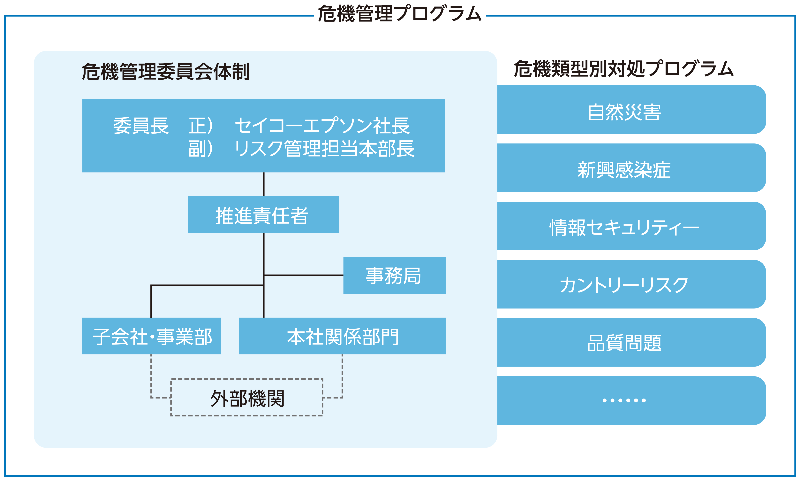 エプソンでは平時より、グループ経営に重大な影響を及ぼすと想定されるリスクの発現に迅速に対処するため、 社長を委員長、リスク管理担当本部長を副委員長とする危機管理委員会の体制と初動対応手順を定めた危機管理プログラムを整備し、有事に備えています。