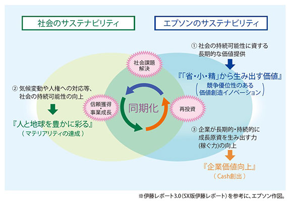 「『省・小・精』から生み出す価値」で、社会課題を解決し、社会の持続可能性に資する長期的な価値を提供していく、それが、「人と地球を豊かに彩る」ことにつながるパーパスを中心に据えたサステナビリティ経営とも言えます。