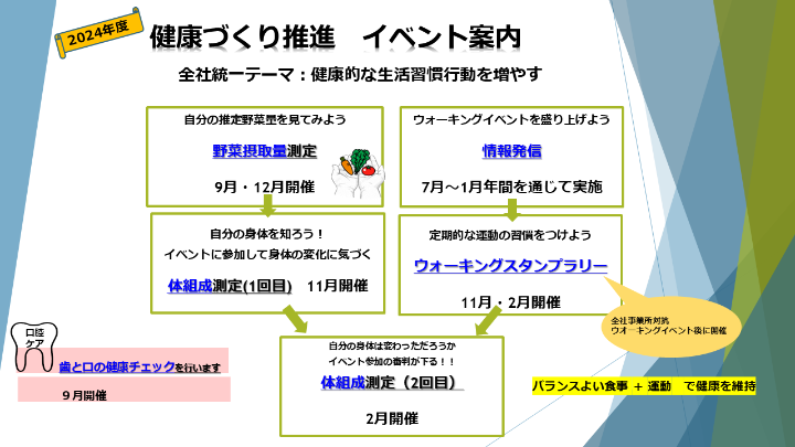 そのために働く人と会社が一体となり、いきいきと楽しく働くことができる職場環境をつくり、こころとからだの健康づくりに取り組みます。