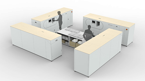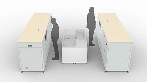 4台を囲むように配置することもできます。複数機器への給排紙に関するオペレーションが1ヶ所にまとまることで、スムーズな機器への給紙と機器から生産された用紙の集積が実現し、用紙の生産性の向上に貢献します。