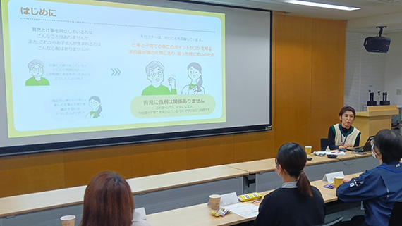 エプソンでは2021年から、育児と仕事の両立を支援する「両親学級セミナー」を継続して開催しています。これから親になる社員や育児中の社員に向けて、制度の活用方法、働き方の見直し、パートナーとの対話の重要性などを伝えています。